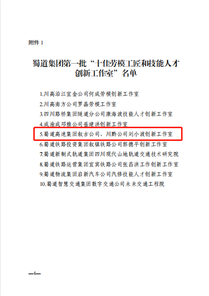 蜀道高速集團(tuán)敘古、川黔公司劉小波創(chuàng)新工作室榮獲蜀道集團(tuán)第一批“十佳勞模工匠和技能人才創(chuàng)新工作室”稱號(hào)