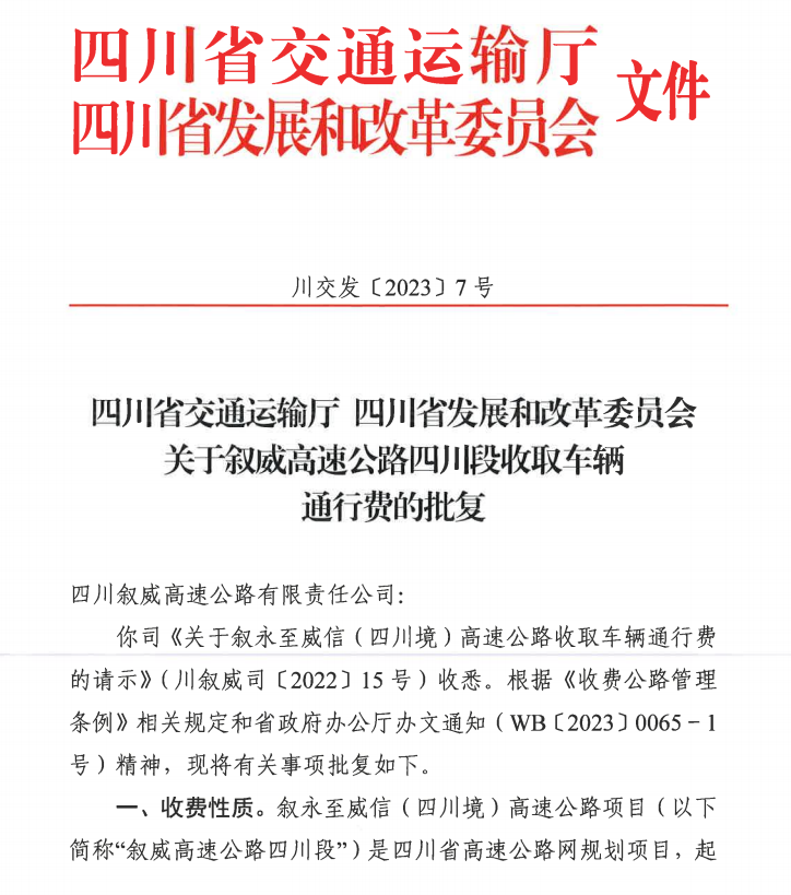 敘永至威信(四川境)高速公路(以下簡稱“敘威高速公路”)是四川省高速公路網規劃項目,起于瀘州市敘永縣境內,與納黔公路相接,經長秧、枧槽、長壩、分水,止于下河,對接云南宜畢高速公路敘永支線,路線全長35.335公里,雙向四車道,于2018年6月開工建設,2021年7月1日建成通車。經四川省人民政府同意,根據四川省交通運輸廳 四川省發展和改革委員會《關于敘威高速公路四川段收取車輛通行費的批復》(川交發〔2023〕7號)精神,批準敘威高速公路于2023年3月17日零時正式聯網收取車輛通行費,現公告如下: