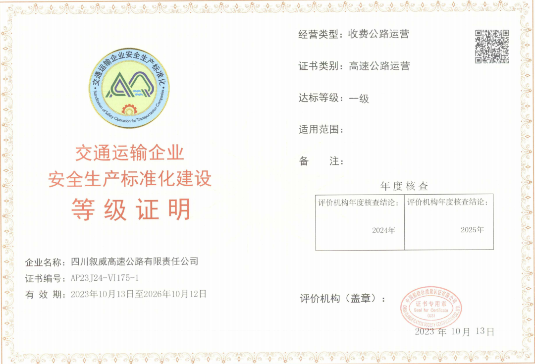 近日,敘古、敘威公司分別取得四川省交通運輸企業安全生產標準化一級企業達標證書,標志著敘古、敘威公司圓滿完成安全生產標準化一級達標創建目標任務,為公司安全生產工作再上新臺階奠定堅實基礎。