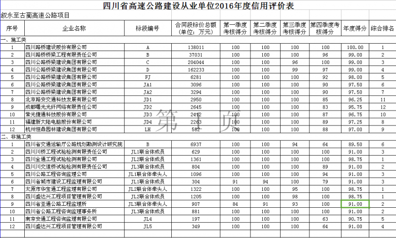 敘永至古藺高速公路從業(yè)單位2016年信用評(píng)價(jià)公示表