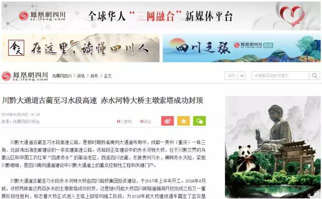 6月29日上午10點23分,赤水河大橋(四川岸)主墩索塔成功封頂,標志著該大橋正式進入上部結構施工階段,為如期實現赤水河大橋的建成通車目標奠定了堅實基礎。這一消息受到了中央電視臺、中國交通報、四川衛視、四川日報、鳳凰網、四川工人日報、四川經濟日報等媒體的競相報道。