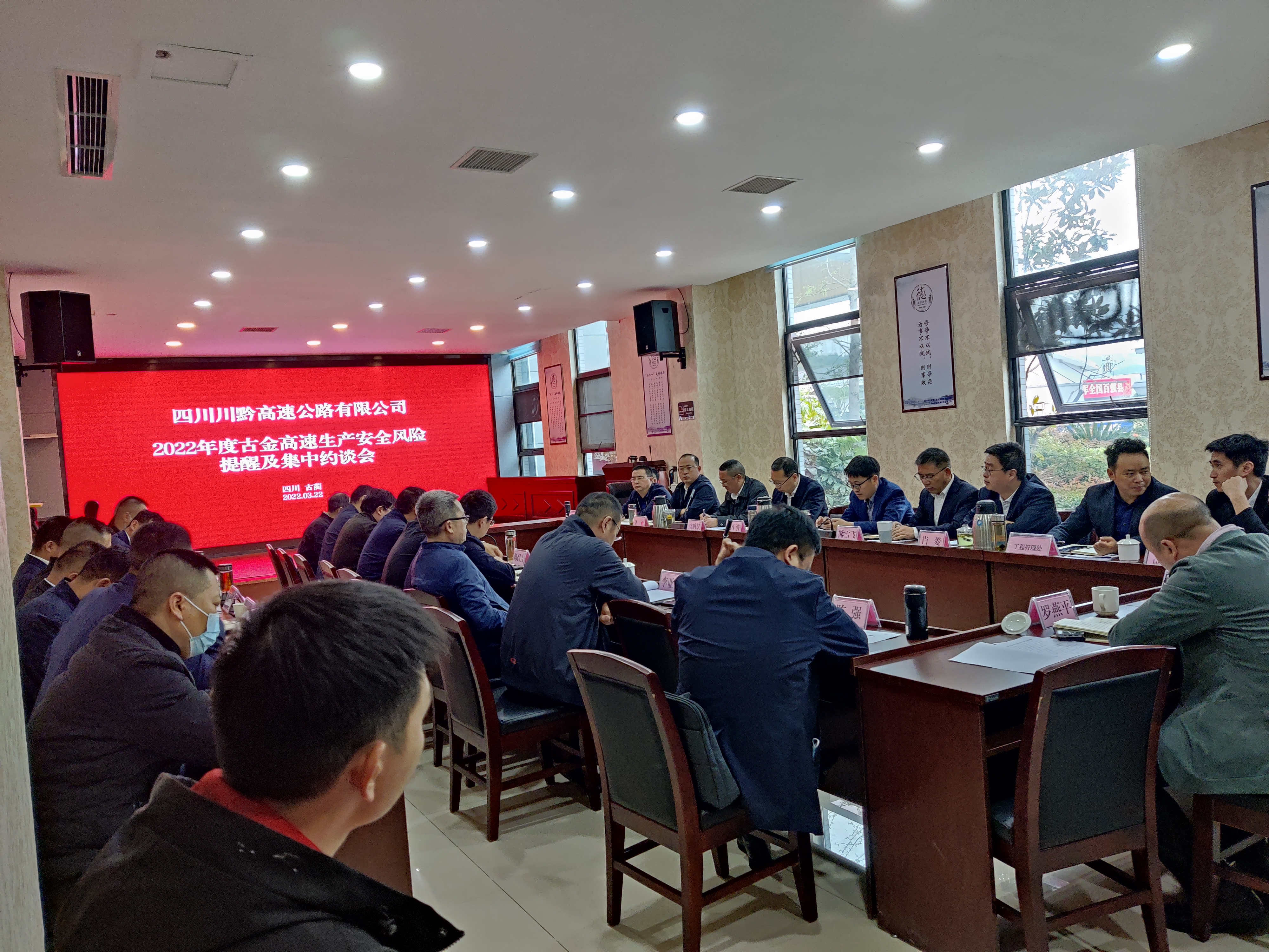3月22日下午,川黔公司組織召開2022年古金高速公路生產安全風險提醒及集中約談會,公司副總經理高鵬斌主持會議,總經理喬勝俊、董事長劉小波出席會議并發表講話。