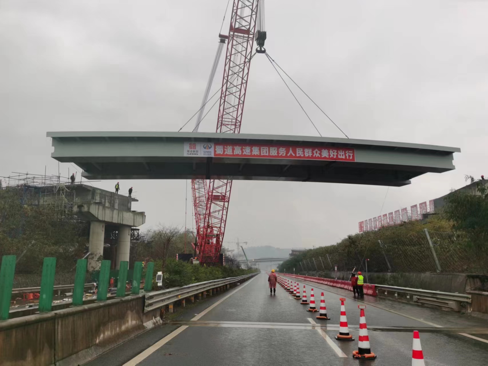 為克服以上困難,參建單位精心組織,多措并舉:一是協(xié)調(diào)各方,斷道施工。參建單位積極與高速公安、高速執(zhí)法等相關(guān)單位進行聯(lián)系,實行敘古高速全幅斷道,并利用其半幅路基拼裝,單幅雙向通行,充分保證施工安全進行。二是反復(fù)勘探現(xiàn)場,專題研討方案。參建單位聯(lián)合“一路三方”代表多次到現(xiàn)場踏勘,確定封道時間、變道口位置并組織專題會議探討吊裝方案,細化吊裝組織,確保鋼箱梁順利吊裝就位。三是加強安全技術(shù)交底,明確責任分工。吊裝前多次組織召開安全、技術(shù)交底會,明確分工、細化職責、責任到人,重點明確關(guān)鍵環(huán)節(jié)和工序的施工要點。在吊裝過程中,強化現(xiàn)場安全管控,吊裝作業(yè)指令執(zhí)行有序,各工序銜接順暢,嚴格作業(yè)過程質(zhì)量把控。