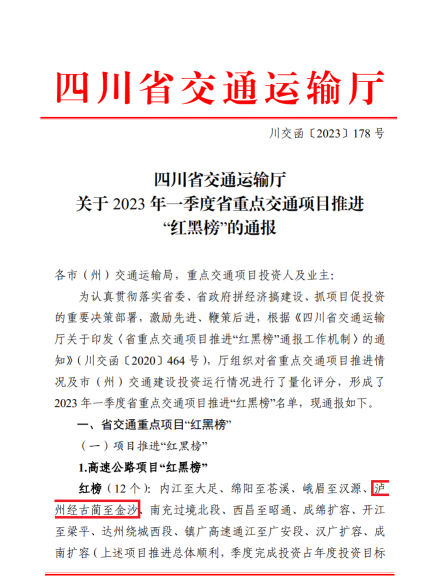 4月19日,四川省交通運輸廳發(fā)布《關(guān)于2023年一季度省重點交通項目推進(jìn)“紅黑榜”的通報》(川交函〔2023〕178號),川黔公司投建的古金高速榮獲2023年第一季度省交通重點項目中高速公路項目推進(jìn)“紅榜”表彰。